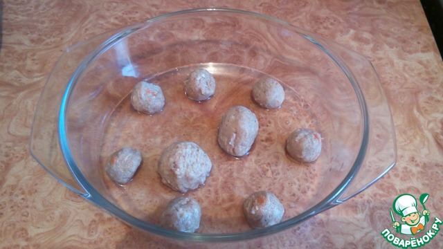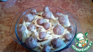 Кладем на дно блюда фрикадельки. (у меня покупные полуфабрикаты, я лентяйка, но их вполне можно заменить любым фаршем или просто мясом)