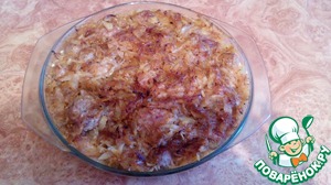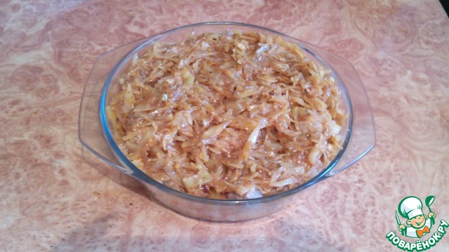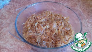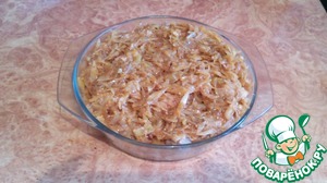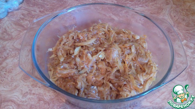 Посыпаем слоем тушеной капусты. Я тушу так: на пол кочана не большой капусты одна средняя луковица и одна морковка, немного поджариваю, накрываю крышкой, тушу минут 20 и в конце добавляю три ст. л. томатного соуса, тушу еще минут пять и все))