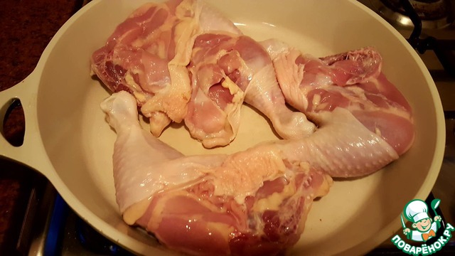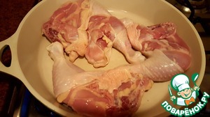 Разогреть сухую сковороду и выложить окорочка кожей вниз. На среднем огне обжарить окорочка. Весь подкожный жир вытопится и кожа преобретёт румянец.