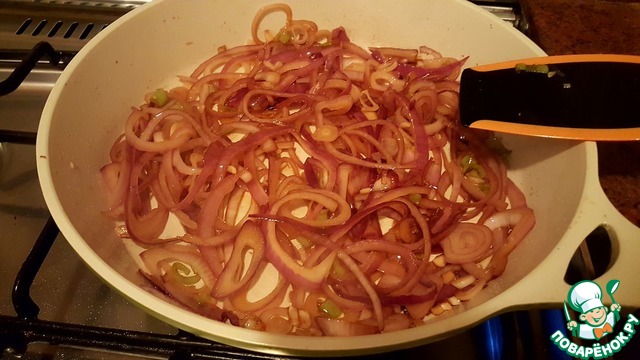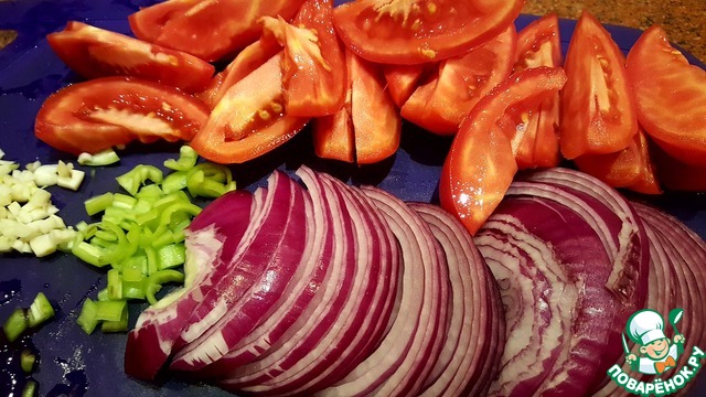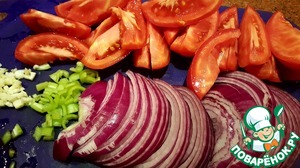 Нарезать овощи. Острый перчик очистить от семян, если, конечно, не хотите острого блюда. Я готовила в рассчете на ребёнка и блюдо получилось с мягкой остринкой во вкусе.