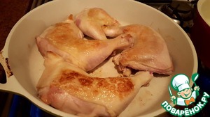 Перевернуть окорочка и обжарить с другой стороны, буквально пару минут. Не давайте курочке гореть.