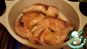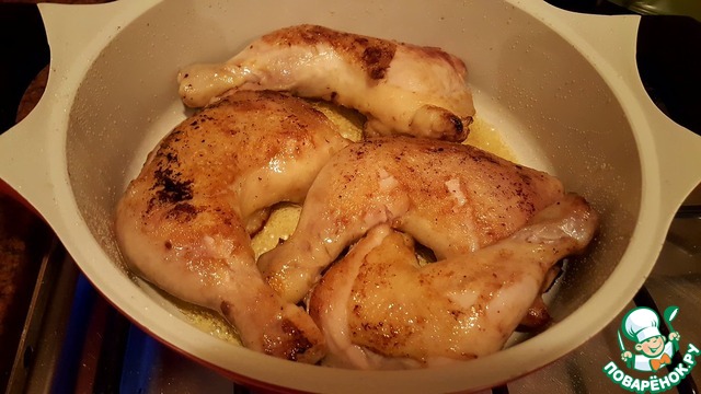 Разогреть в другой сковороде ложку топлёного масла, переложить окорочка в масло и снова обжарить с двух сторон. Затем накрыть крышкой и тушить до готовности. В принципе, можно и не накрывать крышкой, но лично я опасаюсь непрожаренного мяса курицы.
