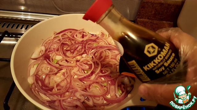 На отдельной сковороде разогреть вторую ложку масла, выложить лук, чеснок и острый перец, и быстро обжарить на среднем огне. Добавить ложку или чуть больше соевого соуса и активно помешивая, выпарить лишнюю жидкость.