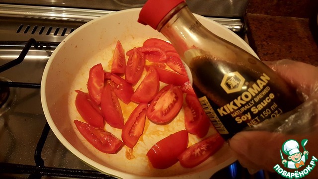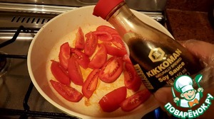 Выложить в сковороду помидоры и прогреть пару минут, затем сбрызнуть соевым соусом, слегка выпарить жидкость и переложить помидоры на блюдо к луку.