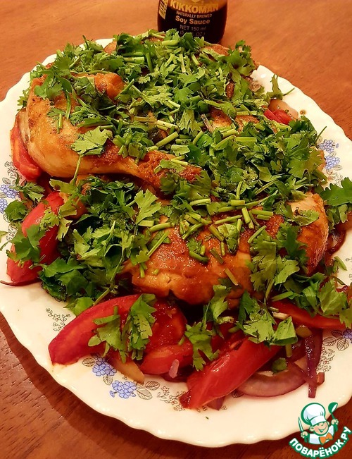 На овощи выложить готовые окорочка, щедро посыпать нарезанной зеленью и сбрызнуть соевым соусом.