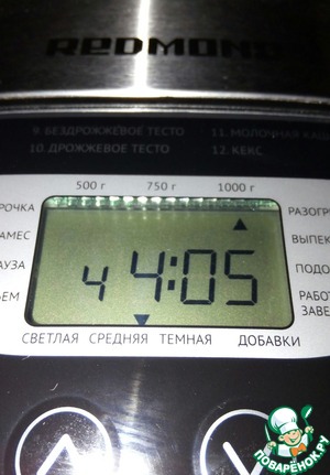 • Закрыть крышку. Установить программу "Французский хлеб". Вес - 1000 г. Цвет корочки средний. Нажать кнопку " старт". Готовить до окончания программы. (4часа)