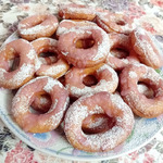 Тесто делим на 2 части. Одну отставляем в сторонку, а другую раскатываем в пласт толщиной 5-7 мм и вырезаем пончики. С другой половиной теста проделываем тоже самое.