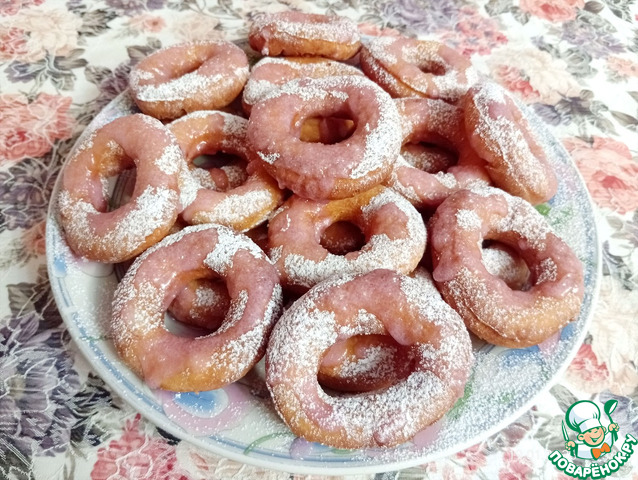 Приготовим глазурь. Сахарную пудру смешиваем с лимонным соком. При желании добавляем пищевой краситель. Готовой глазурью поливаем донаты.