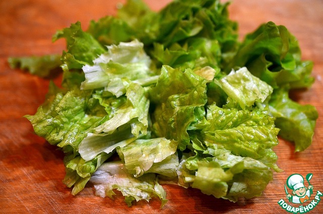 • Выложить овощи к салатным листьям, перемешать. Для заправки кинзу и мяту мелко нарезать.