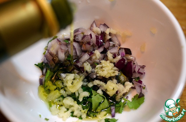 • Добавить оливковое масло, мелко нарезанный лук, лимонный сок, измельчённый чеснок, сумах.