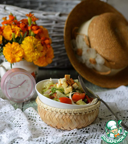 Салат похож на любимую Панцанеллу. Но тут очень насыщенная заправка по вкусу. Не было лаваша. Положила самодельные сухарики.