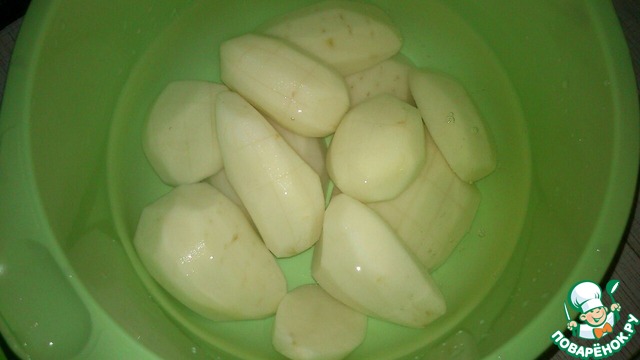 Картофель очистить, порезать пополам и надколоть сверху вилкой или сделать надрезы решеткой. Это нужно для того, чтобы она равномерно пропарилась