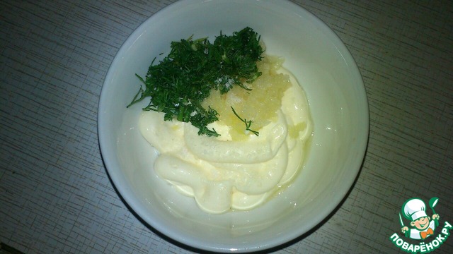 Тем временем готовим соус. Смешать чеснок выдавленный через чеснокодавилку, зелень, перец и сметану. Перемешать.