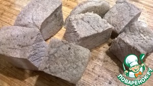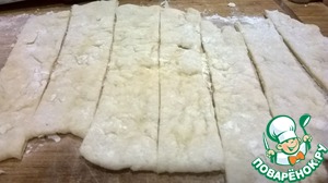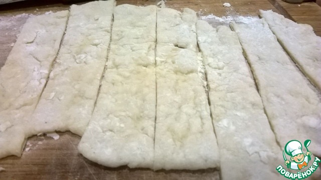 Из яйца и муки замесить крутое тесто. Раскатать толщиной 3 мм. Разрезать на прямоугольники.