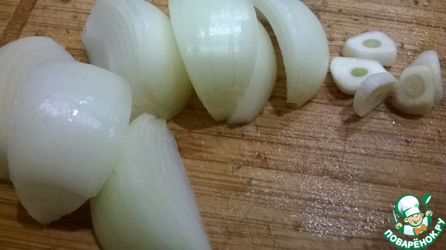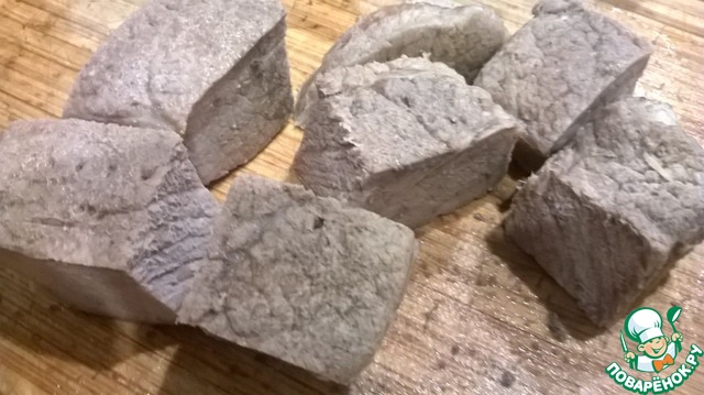 Мясо отварить одним куском до полуготовности в воде с соевым соусом Kikkoman, перцем и лавровым листом. Это примерно минут 40.
