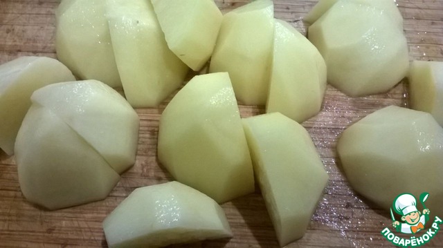 Мясо разрезать па крупные кусочки и вернуть обратно в кастрюлю. -