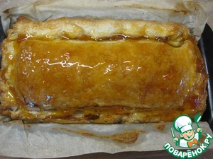 Закрываем вторым пластом теста, тщательно защипывая края. Отправляем выпекать в предварительно разогретую до 180С духовку на 30-40 минут ( у меня запекался 40 минут) до золотистой корочки.