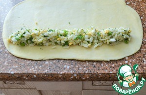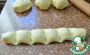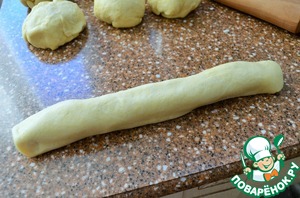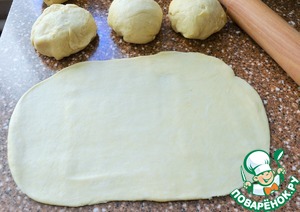 Тесто разделить на 6 частей, по 187 г. Раскатать одну часть в прямоугольник, 20 на 30 см.