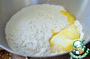 Всыпать просеянную муку, соль и добавить мягкое сливочное масло.