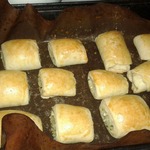 Аккуратно выложить заготовки на противень. Смазать желтком.