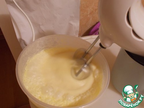 В это время растопить сливочное масло, вылить в миску, добавить стакан молока и три яйца (все продукты должны быть теплыми). Все взбить.