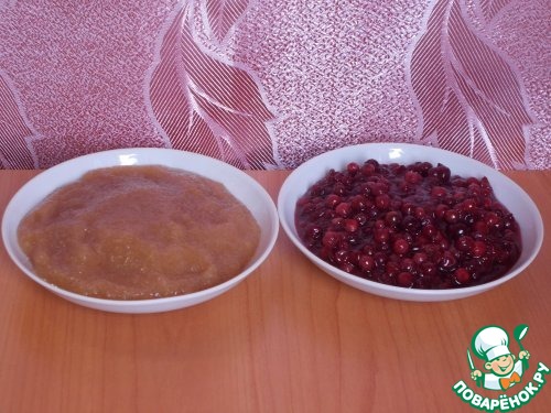 Когда оно увеличится в два раза можно начинать готовить пирог. Пеку всегда на противне. Раскатываю тесто в круг, делаю бортики, вилкой накалываю донышко. Посыпаю слегка крахмалом и выкладываю сначала яблочное пюре, а сверху бруснику, перемешанную с сахаром..