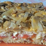 А теперь мои замечания. Количество продуктов рассчитано на большую форму. Я взяла сначала d 23 и глубиной 4 см (в рецепте не указано, какая форма использовалась), но, когда выложила все слои начинки, форма оказалась заполненной доверху, тесто наливать было некуда. Пришлось делать сложную операцию по опрокидыванию всего этого сначала на блюдо, а потом с блюда в форму большего диаметра (d 24 и глубиной 6 см). В результате слои, конечно, немного нарушились. Пирог надо есть горячим, так как сыр тянется только, пока пирог горячий, потом застывает. Начинка - да, сочная, но фасоль оказалась жестковата, я бы ее пробланшировала несколько минут предварительно. И теста мне оказалось мало, пришлось срочно еще порцию сделать из 1 яйца. В любом случае, идея очень хорошая, с начинками можно экспериментировать. Например, шампиньоны взять свежие и обжарить их, а то консервированные слишком пресные. Всем удачного дня!