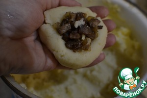 Делаем из картофельного теста лепешку, кладем мясную начинку, формируем шарики.