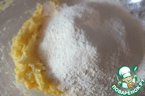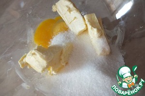 Желток, размягченное сливочное масло, сахар (1 столовую ложку оставляем) и ванильный сахар смешиваем. -