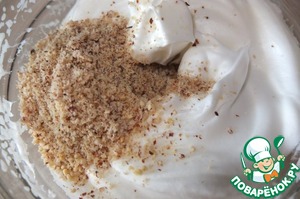 Белок взбиваем с 1 столовой ложкой сахара до устойчивых пиков, добавляем орехи, перемешиваем.