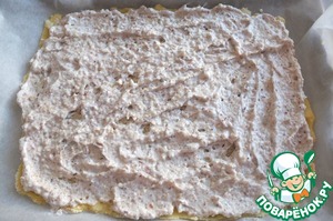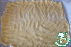 Тесто выкладываем на противень, застеленный пекарской бумагой. Раскатываем в тонкий пласт, я разравнивала руками.