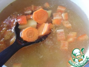 Морковь нарезать кружочками, перец - небольшими кубиками. Подготовленные овощи добавить в суп, варить 5 минут.