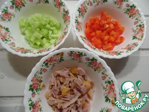 Сердцевину огурца, перец и курицу мелкими кубиками.