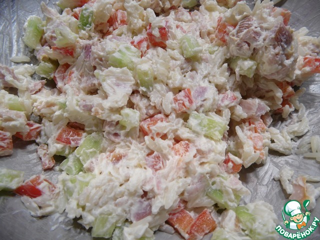 Смешать рис, нарезанные овощи и курицу с творожным сыром.