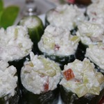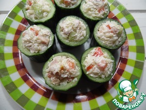 Полученной начинкой нафаршировать огуречные "бочонки", украсить по желанию.