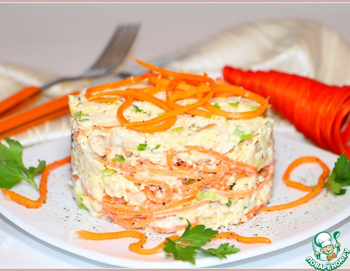 Почему салат называется именно так, как говорится за что купила, за то и продаю. Салат, думаю, Вам знаком, он такой, да не совсем. Нами очень любим, часто повторяемый, на праздничный стол поставляемый. И если "Гости в домофоне" быстро приготовляемый!!!