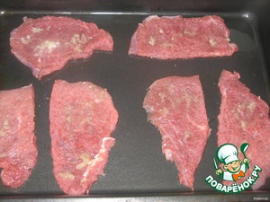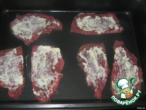 Выложить на смазанный маслом противень, натереть измельченным чесноком.