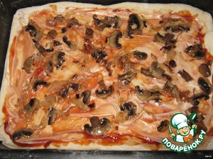 Раскатанное тесто, толщиной 3-5 мм выкладываем на смазанный подсолнечным маслом противень(также противень посыпаем слегка мукой). Затем смазываем кетчупом и майонезом.