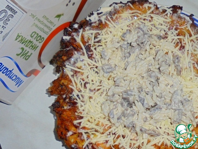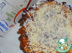 • Лепешку посыпать тертым сыром и разложить начинку.