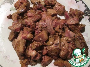 Очистите печень от пленок и протоков, нарежьте ломтиками, залейте молоком и дайте постоять минут 20. Затем промойте, обваляйте в муке и обжарьте в двух столовых ложках растительного масла до полуготовности.