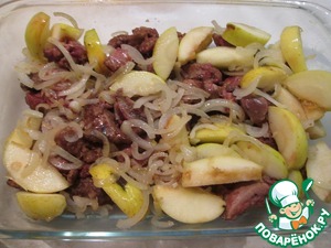 Разогрейте духовку до 180 градусов. Лук нарежьте тонкими полукольцами. У яблок вырежьте сердцевину, нарежьте дольками. Обжарьте в оставшемся масле до мягкости лука. Следите, чтобы яблоки не развалились. В форме для запекания соедините печень и лук с яблоками, посолите, поперчите и поставьте в духовку минут на 15 - 20.