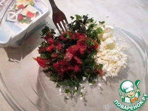 Мелко нарежьте помидоры, маслины и зелень. В миске раскрошите фету, смешайте с остальными ингредиентами начинки.