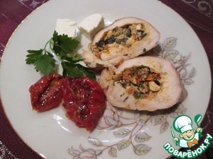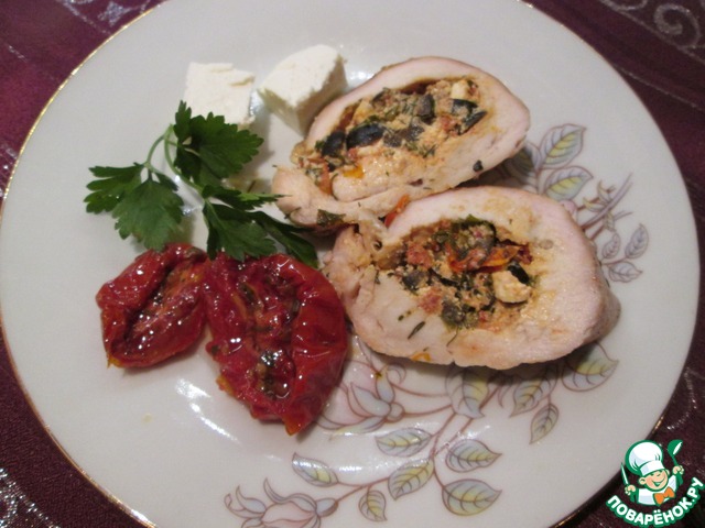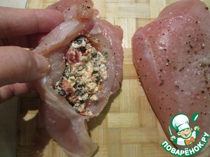 Используя острый короткий нож, прорежьте в филе "карман". Аккуратно наполните филе начинкой и скрепите разрез шпажкой.