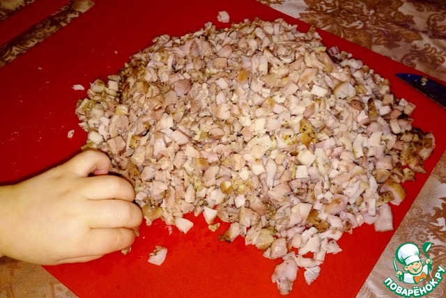 Подготовим мясо. Для салатов мы обычно используем куриное филе или бедра. У куриного филе отделяем малое филе, его очень удобно использовать для отбивных. Бедра освобождаем от кожи и удаляем косточки.