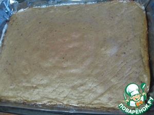 На подготовленный противень, предварительно выстеленный пергаментом и смазанный маслом, выльем наше тесто (слой желательно делать не толстый, максимум 1 см, я не расчитала размеры формы и у меня получился очень толстый корж, что впоследствии затрудняло сворачивать готовый рулет) и поставим в предварительно разогретую до 180С духовку минут на 15.