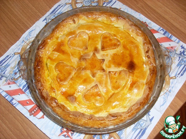 Хороший пирог, только переборщила с мукой и тесто было не таким покладистым... А вот разрез не успела запечатлить, т.к. быстро слопали...Спасибо за вдохновение!
