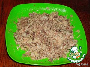 Сок от рыбной консервы слить в рис, а саму рыбу хорошо размять вилкой.