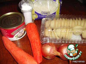В остывший рис добавить тертую морковь, рыбу, а также порезанный четвертинками репчатый лук (при желании лук предварительно можно обдать кипятком).