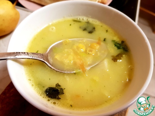 Рецепт из журнала "Школа Гастронома". Суп из курицы и кукурузы.