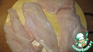 От куриной грудки нам понадобятся только два больших филе, малые отрезаем и используем для приготовления других блюд. Итак, два больших куриных филе разрезаем вдоль, то есть делаем их в два раза тоньше.